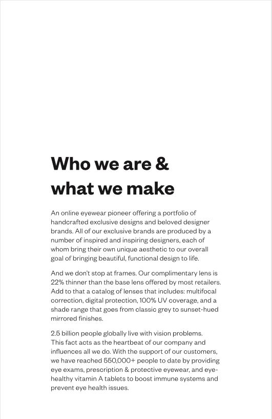 Last year we made a big push toward having a roster of influencers who would regularly wear our glasses and promote our brand. To keep them on the same page and to make sure that they were aligned with our message, our history, and our products, we sent out printed brand books. The goal was to inform, but not overwhelm, and to give a quick snapshot of our individual product lines, including Derek Cardigan. Below is just a sample of the information and brand stories that we included: