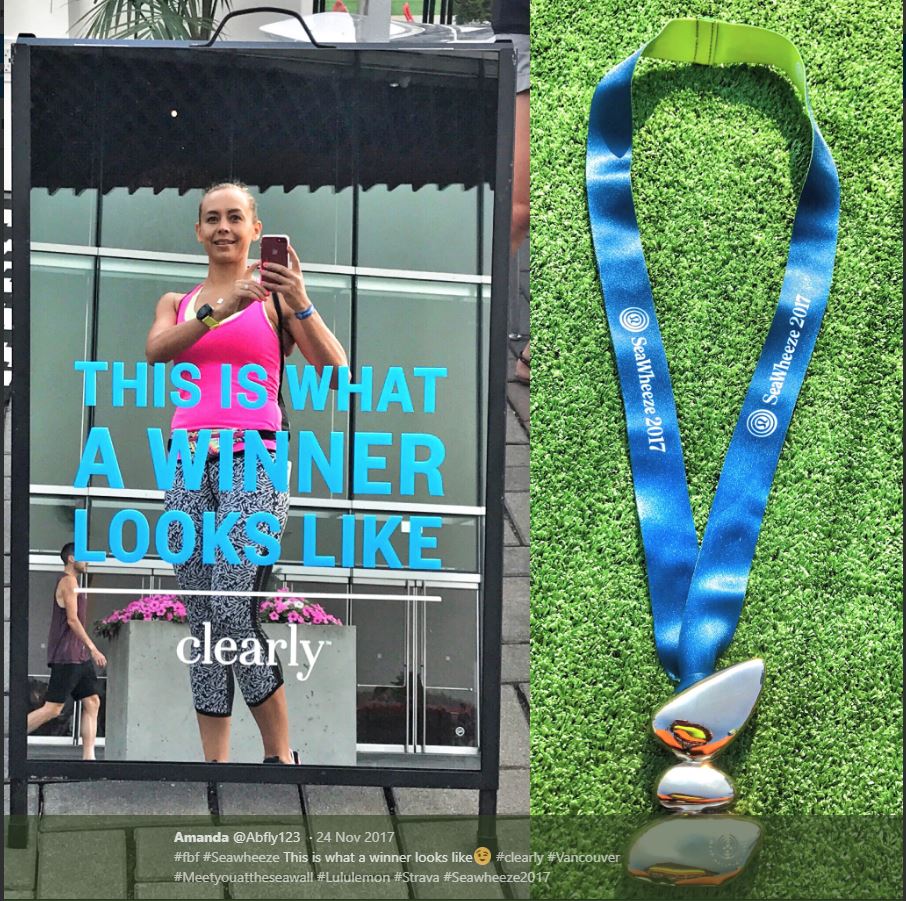 For Seawheeze 2017 we had a booth at package pickup that gave people a little more time to engage with the brand — from temporary tattoos to massages, we wanted people to stick around our tent a little longer and get to know Clearly. One of the biggest hits at the event was this mirrored lunch board sign that let people pre-brag on Instagram before the race. Many photos like this were the result, which was a big hit for social interaction: